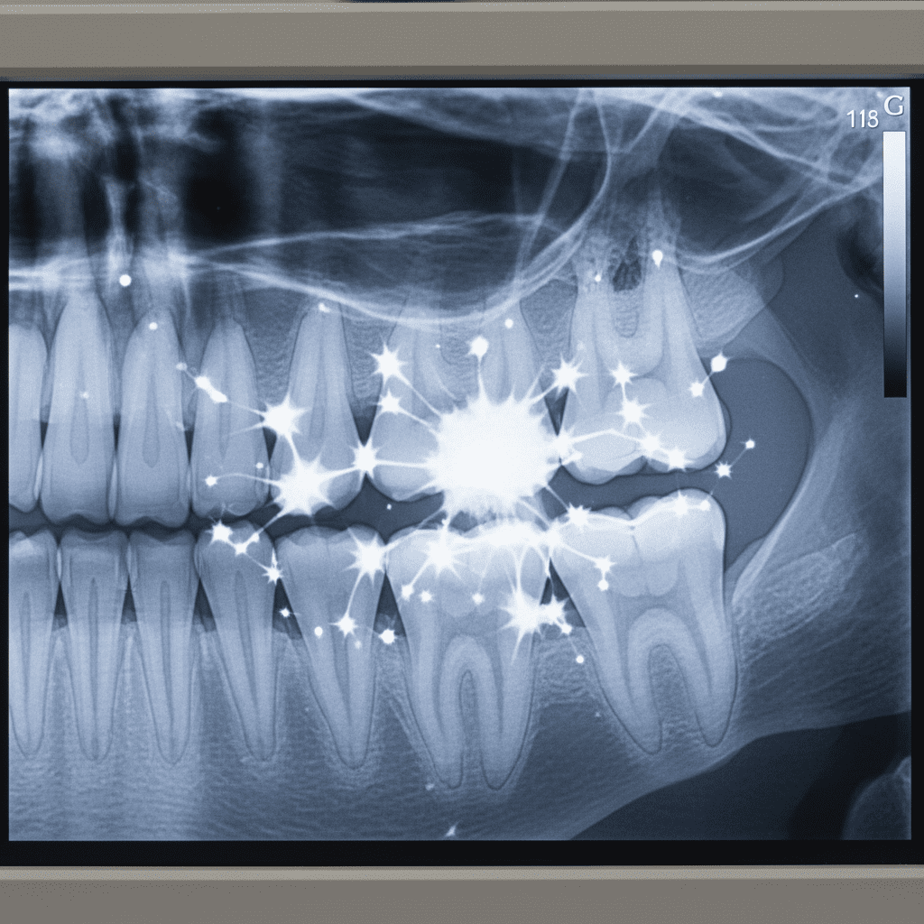 O Twinkle, um artefato observado em radiografias, refere-se ao brilho ou reflexo proveniente de restaurações dentais, especialmente aquelas feitas com materiais altamente reflexivos, como metais. Esse fenômeno é caracterizado pelo seu aspecto cintilante, que pode facilmente ser confundido com outros elementos radiográficos capazes de representar patologias, como cáries ou lesões ósseas.