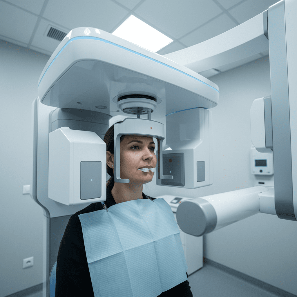 A radiografia panorâmica é um exame radiológico que capta a imagem de toda a boca em uma única radiografia, permitindo uma visualização ampla da maxila, mandíbula e os dentes. Diferente das radiografias intraorais, que mostram cada dente individualmente, a panorâmica usa a técnica de tomografia rotacional. Isso significa que o feixe de radiação gira ao redor da cabeça do paciente, criando uma imagem bidimensional das estruturas dentárias.